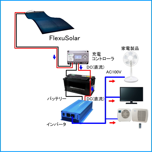 MagflexSolarから発電した電気が充電コントローラで制御されて直流の電気として、バッテリーに充電されます。
