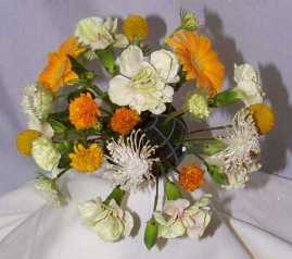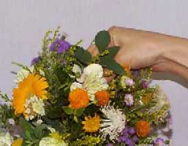 - ガーベラ・ヒメヒマワリなどのオレンジ系の花を3箇所に分けて挿します。(C)