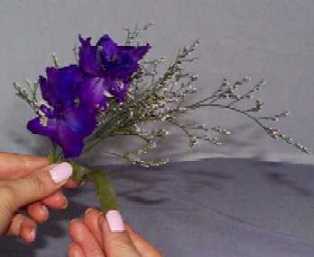 - ブルーファンタジアと紫のデルフィニウムは、束ねてフローラルテープで止めます。