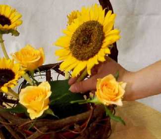 次に、バラをひまわりとひまわりに間に低めに挿します。