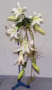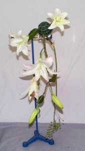 - ノイバラに添わせるように少し短めのユリを挿し、段をつけてもう1本挿し込みます。