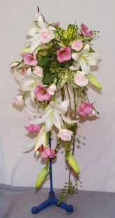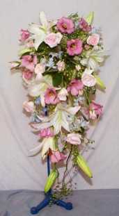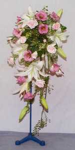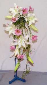 - 色が寂しい所にはトルコキキョウを足し、ミニバラも細かく奥に挿していきます。(F)