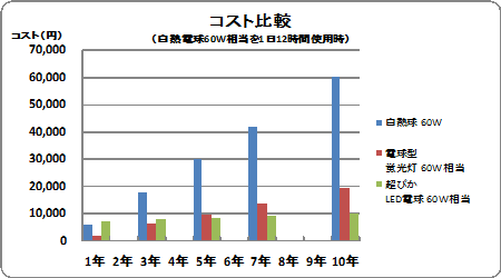 - 一般家庭で広く使われている白熱電球をLED電球に交換するだけで、電気代は白熱電球の約1/20に、電球形蛍光灯の約1/4に!