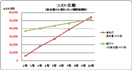 - 事務所、工場でよく使われている蛍光管をLED蛍光管に交換するだけで、電気代は蛍光灯の約半分(1/2)に!