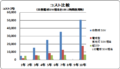 - 一般家庭で広く使われている白熱電球をLED電球に交換するだけで、電気代は白熱電球の約1/20に、電球形蛍光灯の約1/4に!