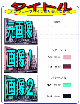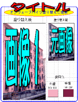 | レイアウト番号1 基本的なレイアウト 元画像とシミュレーションした 画像2枚で構成されている。 画像の横に使用色をのせる ことにより、実際塗られる色が どのような色かがわかる。 スペースに余裕があり 説明、概要などを書き込む こともできる。 |