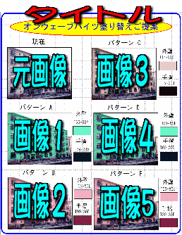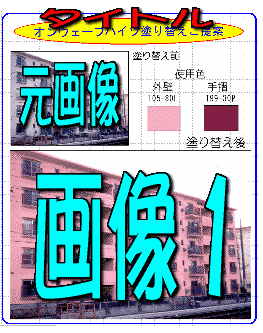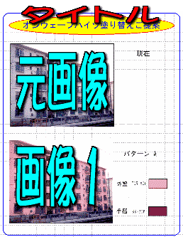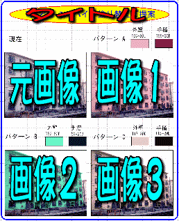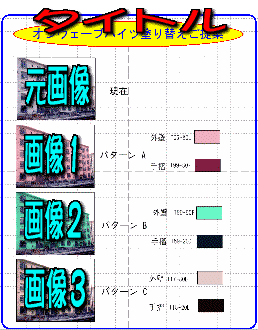 | レイアウト番号1 基本的なレイアウト 元画像とシミュレーションした 画像2枚で構成されている。 画像の横に使用色をのせる ことにより、実際塗られる色が どのような色かがわかる。 スペースに余裕があり 説明、概要などを書き込む こともできる。 |