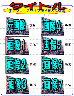 | レイアウト番号8 多画像のレイアウト 元画像とシミュレーションした 画像7枚で構成されている。 上のレイアウトと同じ趣旨 こちらの場合、画像が更に 小さくなり、使用色の サンプルも表示するのは むずかしい。 たくさんの色を試して 見たい人に向いている |